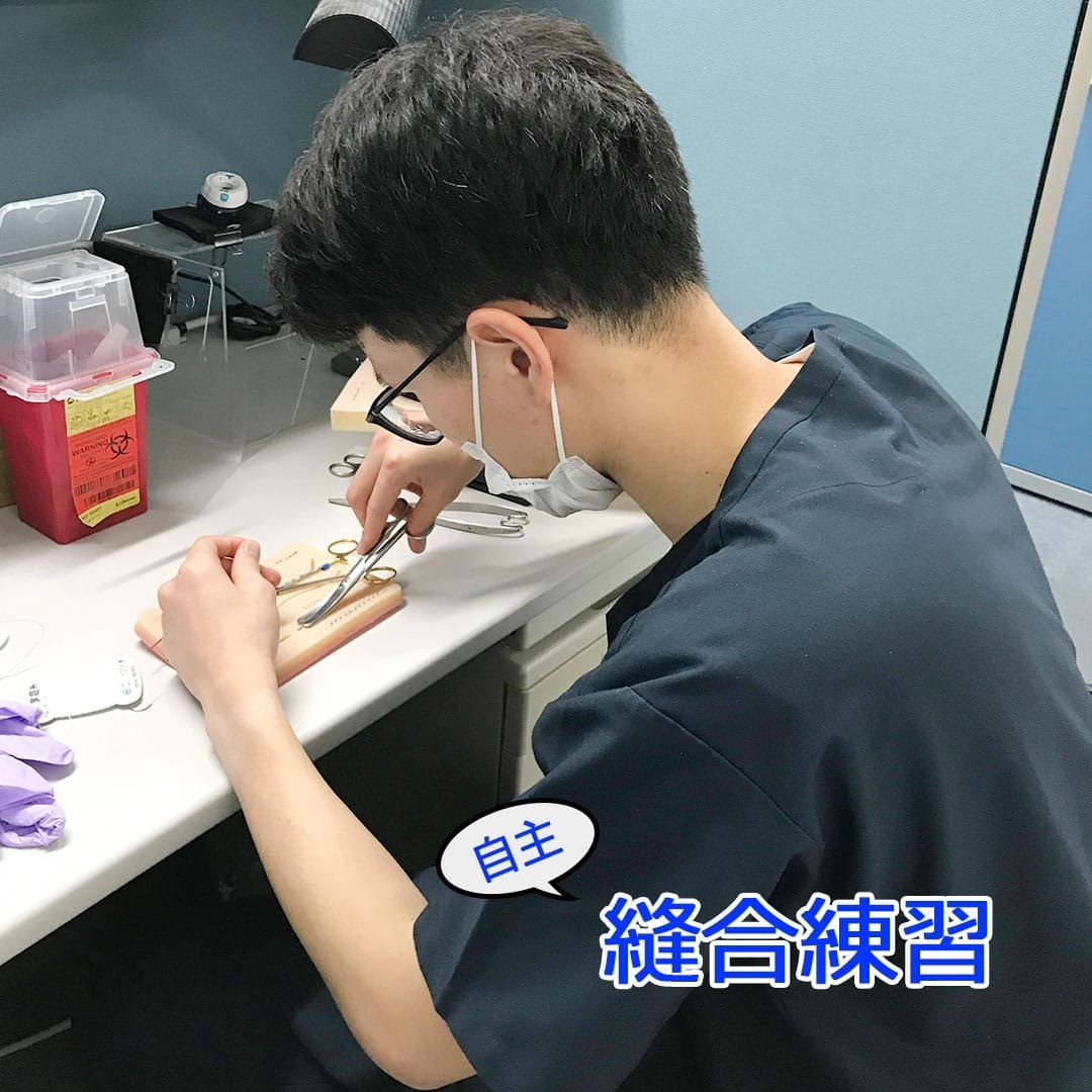 縫合練習中の1年目研修医を発見!現在、整形外科を研修中。将来を見据えて、スキマ時間に自主練しているそうです。